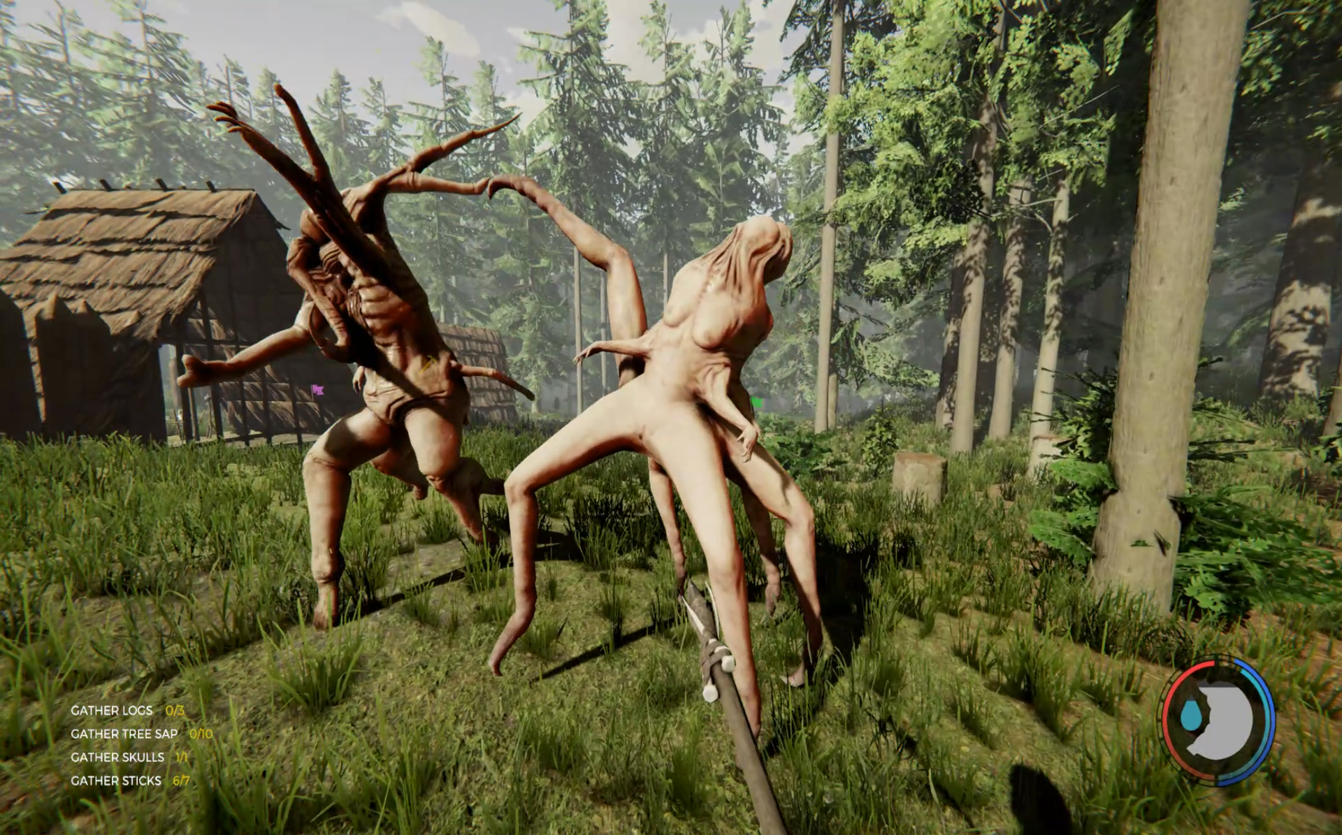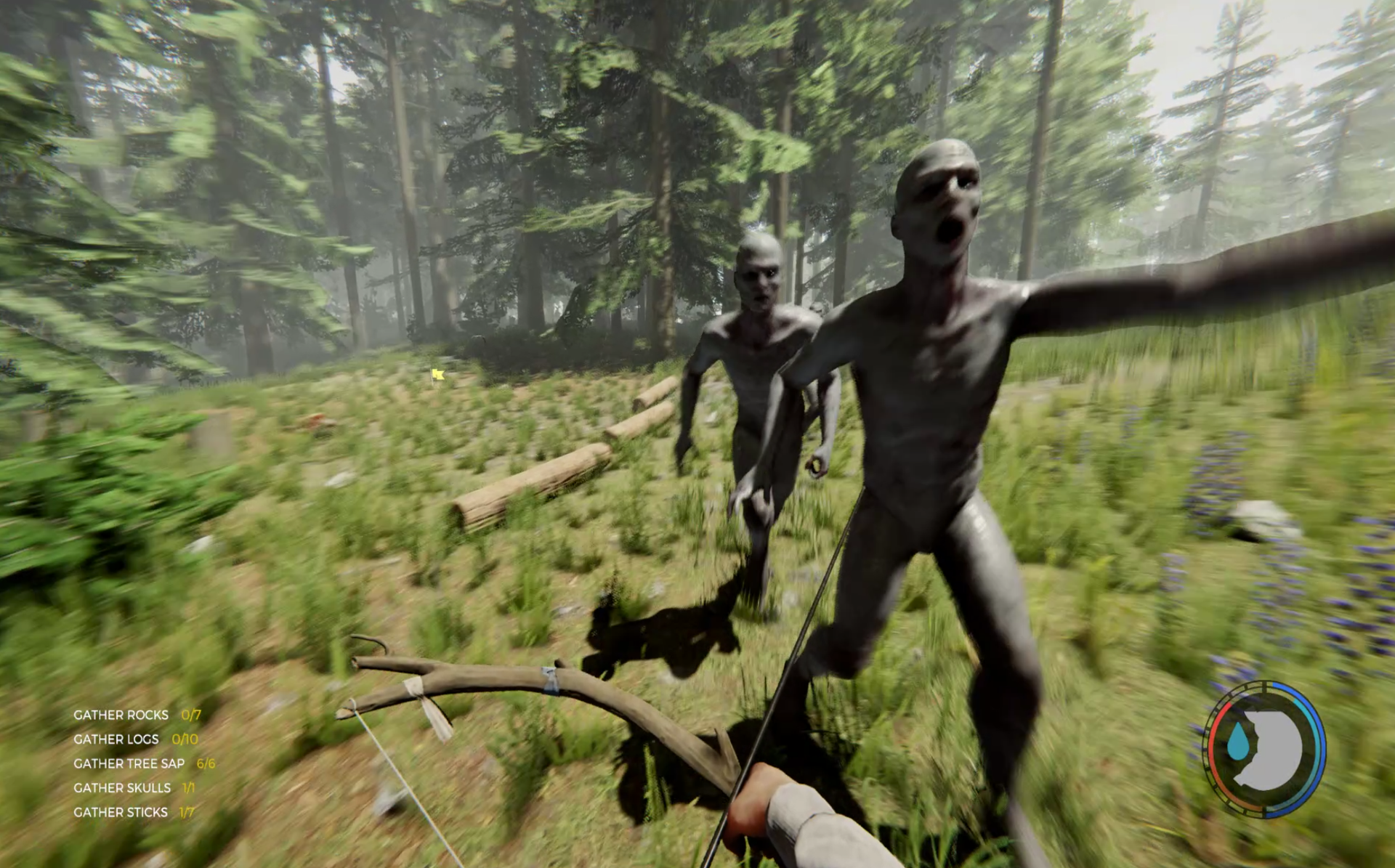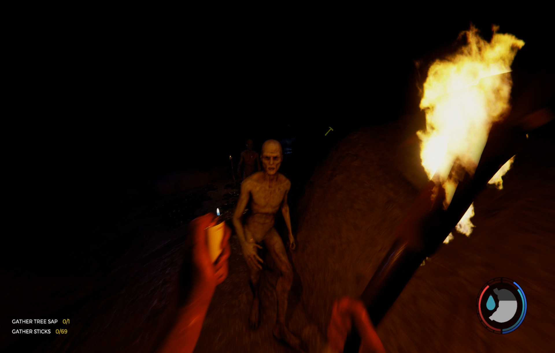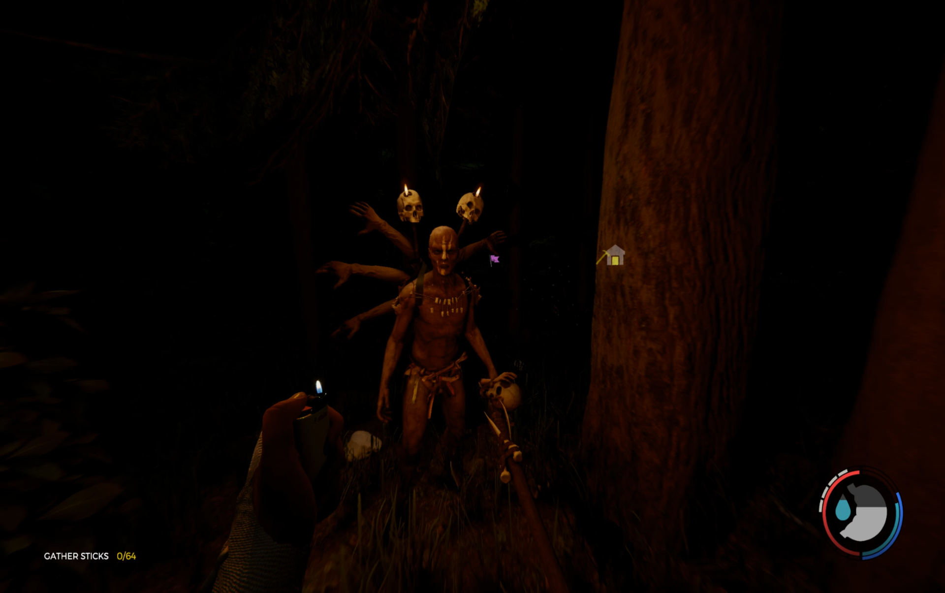 As you progress in The Forest, you will see Cannibals more and more, often roaming in hunting parties or setting up grisly effigies outside your camp. Some are unarmed while others wear intimidating skull lamps and limb adornments. They can also wield deadly Clubs decorated with human and animal remains.